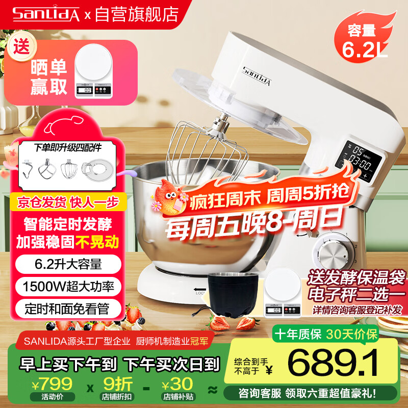 SANLIDA三利达 厨师机6.2升家商两用智能定时和面揉面发酵一体机 快速出膜防黑粉低噪音打蛋机奶油机