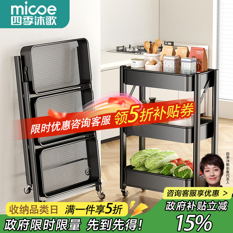 四季沐歌厨房置物架落地折叠小推车置物架免安装零食收纳储物移动果蔬菜篮 3层耀黑【可折叠】常规款
