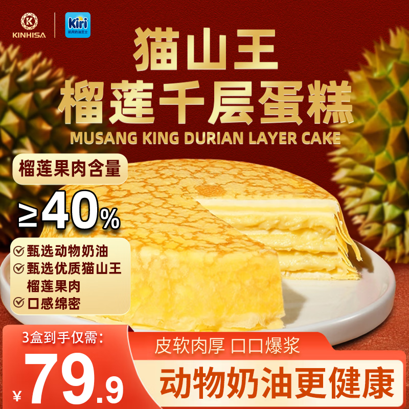 KINHISA猫山王榴莲千层蛋糕Kiri联名动物奶油下午茶点心早餐糕点生日蛋糕 420g*3盒