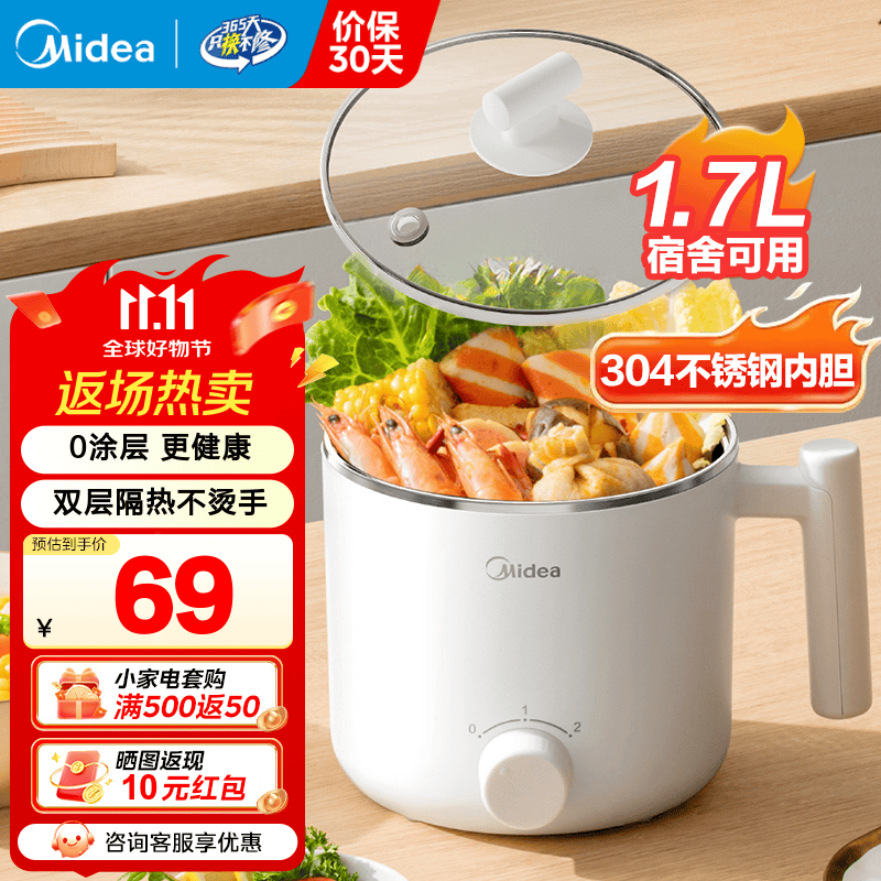 美的宿舍电煮锅不锈钢小型1-2人锅多功能一锅多用泡面锅小型迷你电煮锅小电锅1-2人便携式煮面锅电火锅 1.7L 【304内胆 0涂层】XZE1611