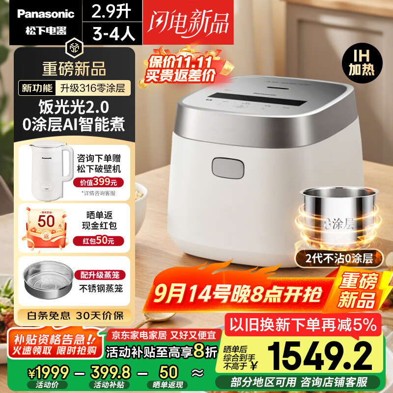 松下(Panasonic)饭光光2.0电饭煲0涂层家用3-4人IH加热煮饭锅无涂层不锈钢一级能效2.9升容量SR-HNS102-W