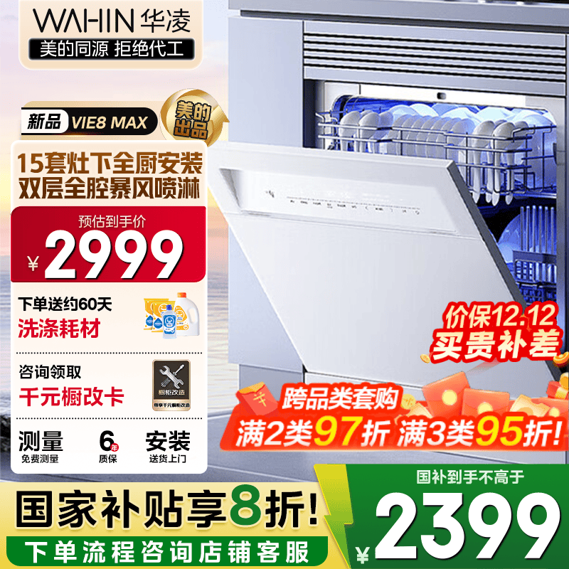 华凌【灶下VIE8Max白】洗碗机嵌入式家用灶下15套升级一键洗烘蒸汽单消毒七星消杀105℃热烘洗消一体机 【美的出品】