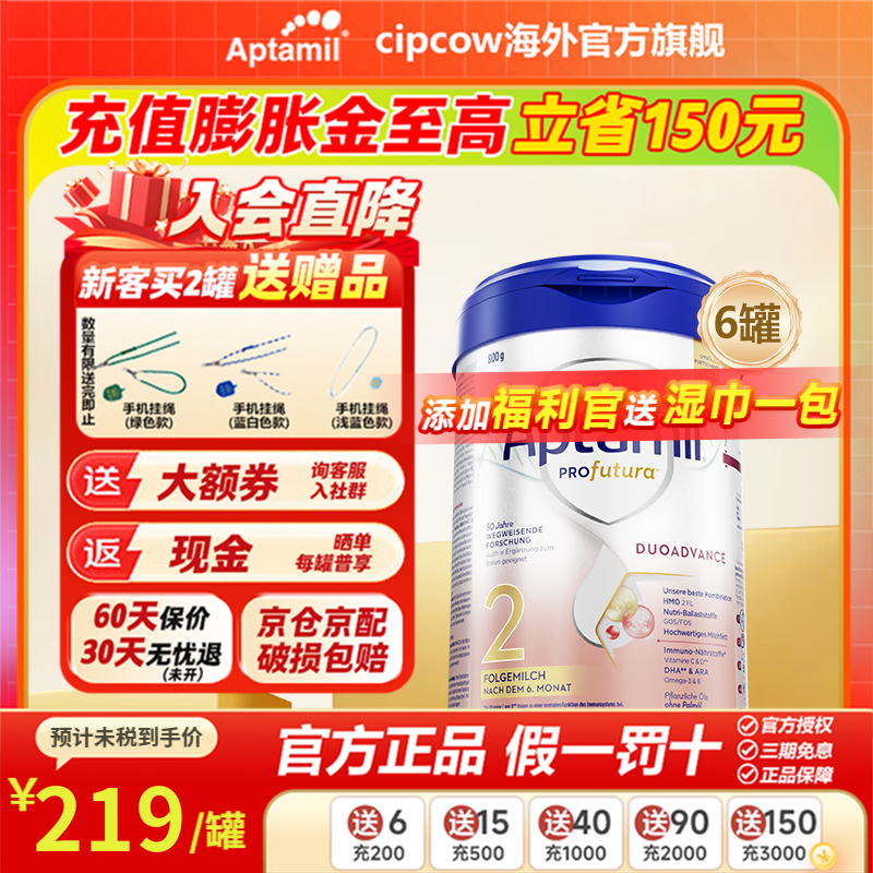 爱他美(Aptamil)爱他美德国白金版 官方授权HMO原装进口婴幼儿配方牛奶粉800g 2段(咨询有礼)-6罐 效期27.5