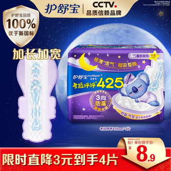 护舒宝考拉呼呼超长夜用卫生巾超长夜用425mm4片姨妈巾京东自营官方旗舰
