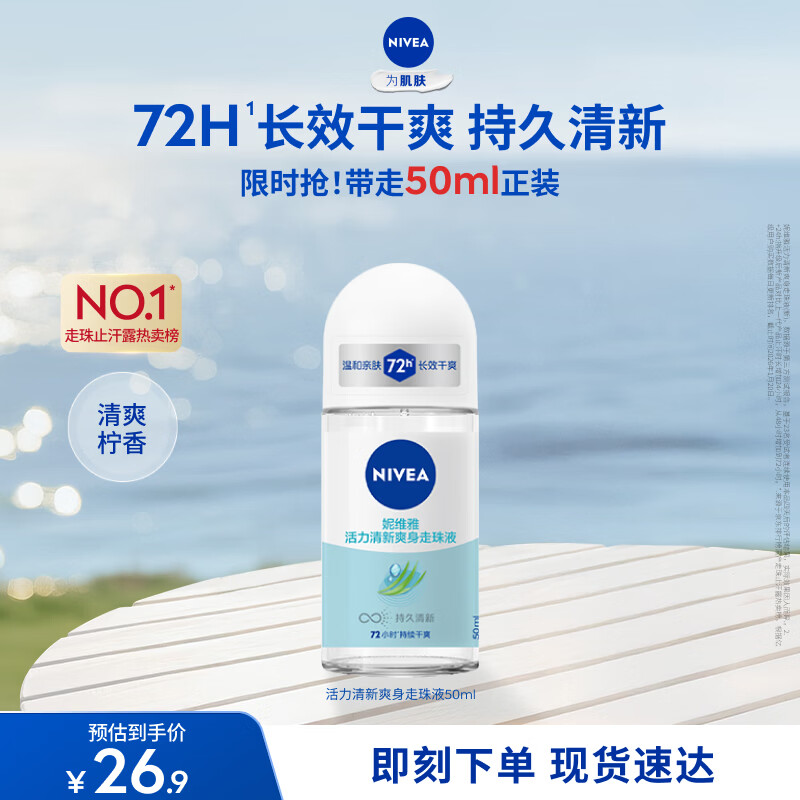 自营妮维雅(NIVEA)抑汗香体腋下止汗露干爽滚珠活力清新爽身走珠液50ml