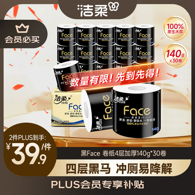 自营洁柔有芯卷纸 黑Face4层140克*30卷 厚韧耐用 卫生纸卷筒纸纸巾整箱