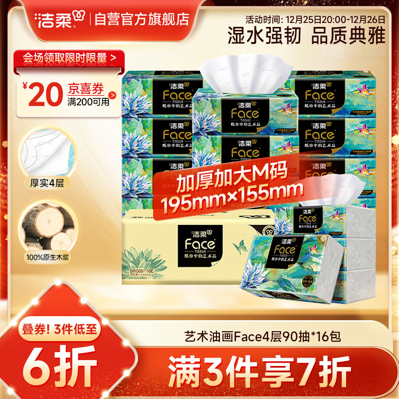 自营洁柔抽纸 艺术油画Face4层90抽*16包 大规格M码 可湿水面巾纸 整箱