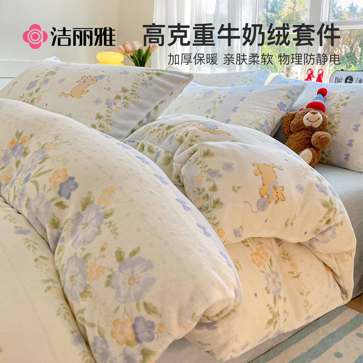 旗舰店洁丽雅床上牛奶绒四件套冬季珊瑚绒加绒床单双面法兰绒床品三件套