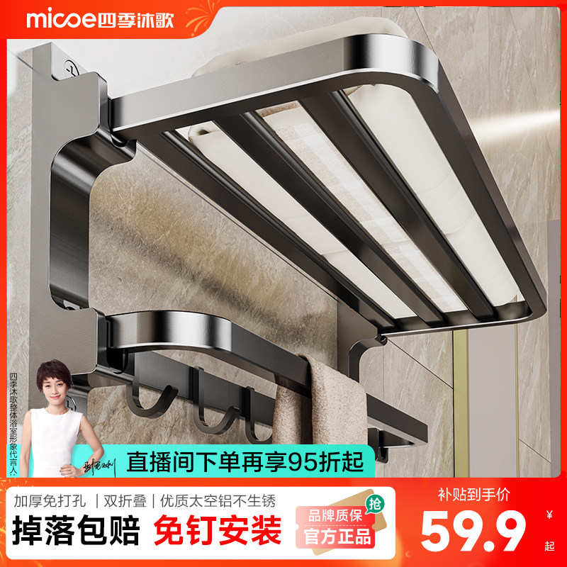 旗舰店【喵住官旗】四季沐歌毛巾架卫生间免打孔折叠置物架洗澡浴巾架