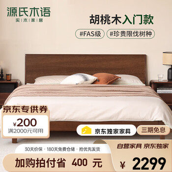 自营源氏木语实木床【月兮】双人床南美黑胡桃斜靠大板床1.8*2.0m低铺