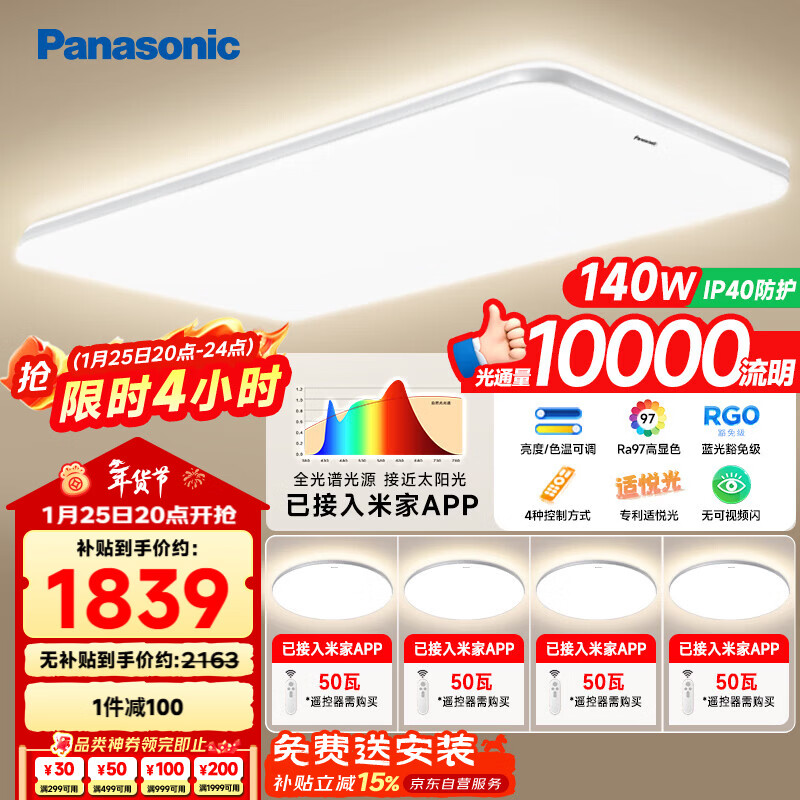 自营松下(Panasonic)吸顶灯 全光谱米家 智能升级款四室一厅 客厅灯【包安装】