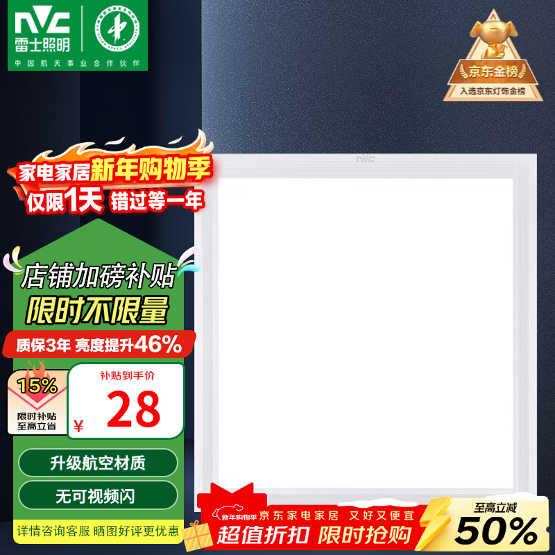 百亿补贴雷士(NVC) 集成吊顶灯 led吸顶灯铝扣板平板灯嵌入式厨房灯面板卫生间灯 珍珠白~18W 正白光 30x30cm