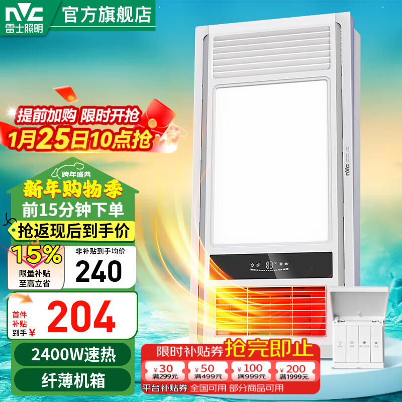 旗舰店雷士(NVC) 卫生间浴室浴霸风暖照明排气一体机高效换气大屏照明吊顶浴霸灯 【热销超薄款】2400W|四功能合一
