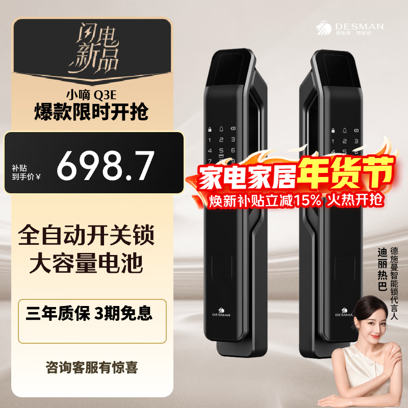 百亿补贴德施曼(DESMAN)智能门锁指纹锁电子密码锁全自动锁防盗门锁电子锁小嘀Q3E 高端黑