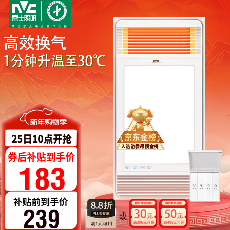 自营雷士(NVC)风暖浴霸单核机械系列超薄照明换气排风四合一体机Y333卫生间浴室