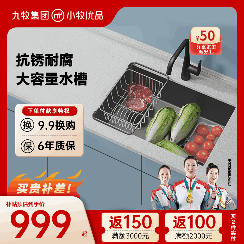 旗舰店九牧小牧卫浴加厚日式水槽洗菜碗盆水池嵌入式304不锈钢方形水池