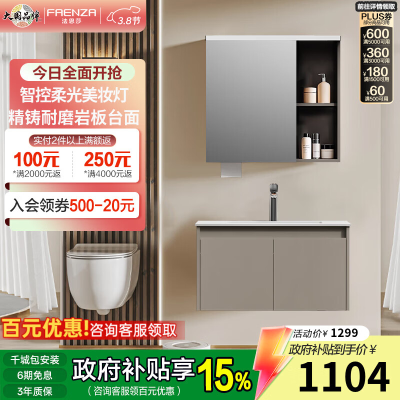 旗舰店法恩莎卫浴奶油风抽拉大收纳主柜防潮防尘美妆岩板浴室柜陶瓷一体盆 【智能款】奶驼灰半开放80cm(岩板台面)