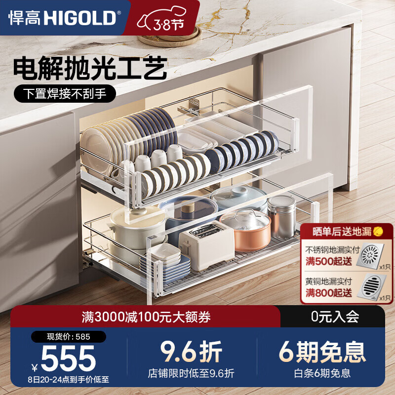 旗舰店悍高(HIGOLD)双层不锈钢拉篮厨房橱柜碗架碗篮配阻尼导轨 600柜 2层 -时尚圆管套装