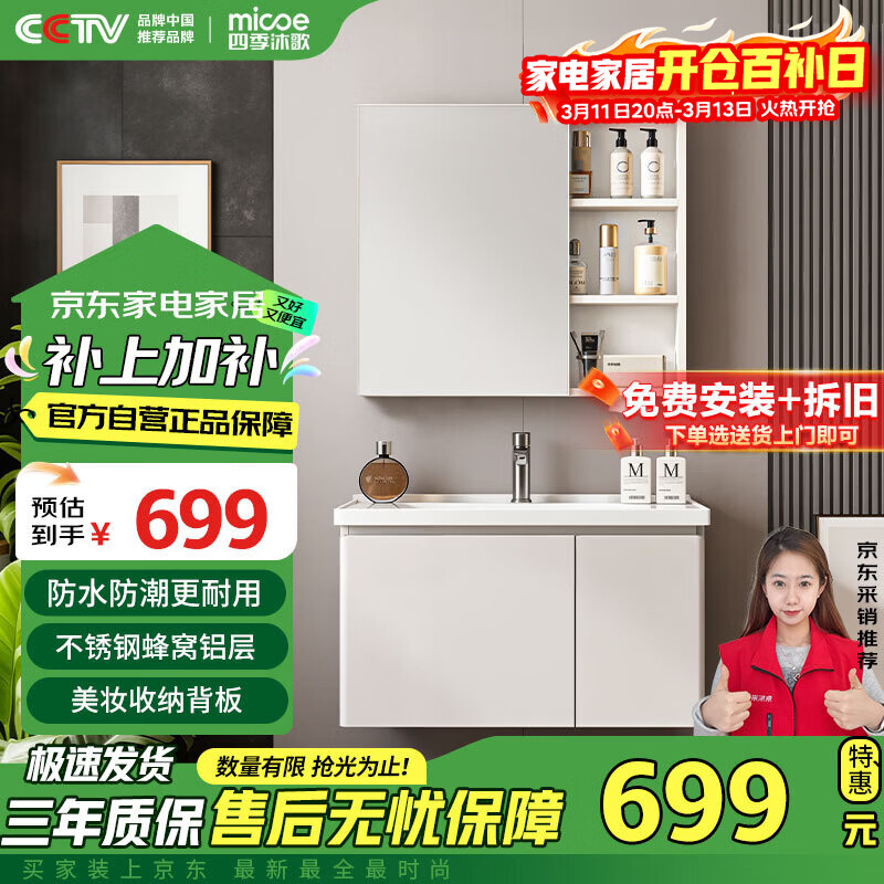 百亿补贴欧帝奴(OUDINU)智能浴室柜 卫生间奶油风陶瓷一体盆洗手洗脸盆柜卫浴洗漱台 组合 智能镜柜-陶瓷盆带配件 80cm