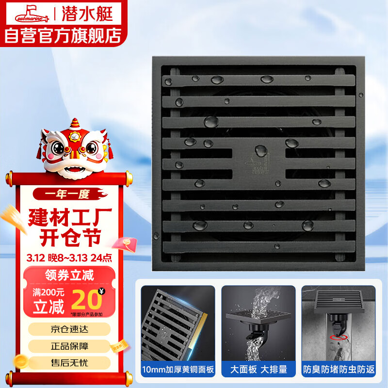 自营潜水艇(Submarine)MTK50-10黄铜镀镍枪灰色拉丝防臭地漏卫生间淋浴大排量地漏50管径