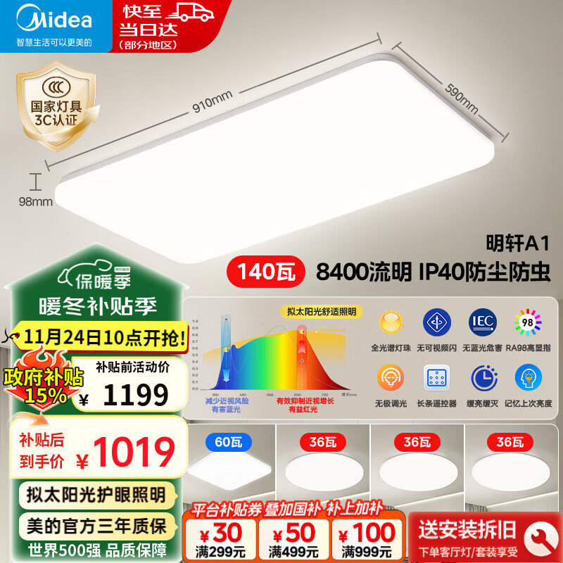 旗舰店美的(Midea)led吸顶灯灯具吸顶灯客厅灯卧室房间灯全光谱护眼灯饰套餐顶灯 智控调光|140W客厅灯|三防
