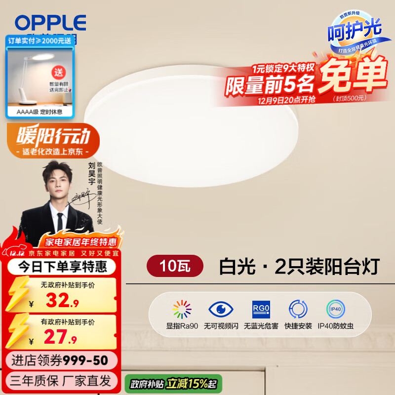 旗舰店欧普(OPPLE)led吸顶灯具儿童房间现代简约圆形阳台卧室灯高显色三防一体快装 2只装阳台灯【白光】10W/770lm