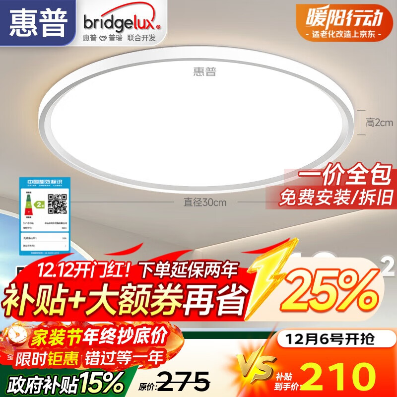 自营惠普普瑞护眼卧室灯吸顶灯超薄超亮智能LED儿童房间书房灯具包安装