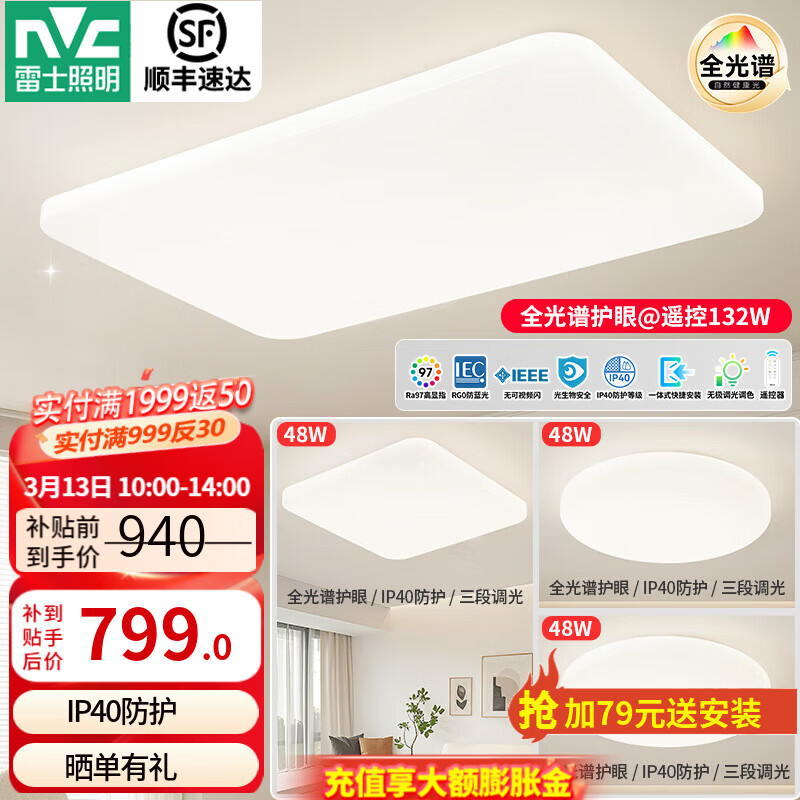 旗舰店雷士(NVC)LED全光谱护眼IP40吸顶灯客厅灯时尚房间卧室餐厅灯饰套餐-白月 全光谱护眼【三室一厅】