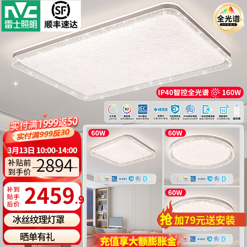 旗舰店雷士(NVC)LED全光谱智能吸顶灯轻奢客厅大灯IP40卧室餐厅灯现代简约冰丝纹 全光谱三室一厅Ra97-4灯