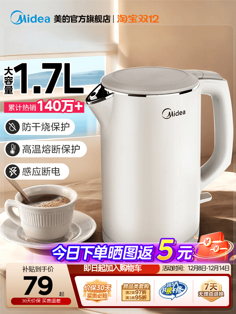 旗舰店美的(Midea)2L大容量电热水壶 1800W家用快速沸腾电水壶烧水壶 不锈钢无缝内胆双层防烫热水壶 2L 【304不锈钢】