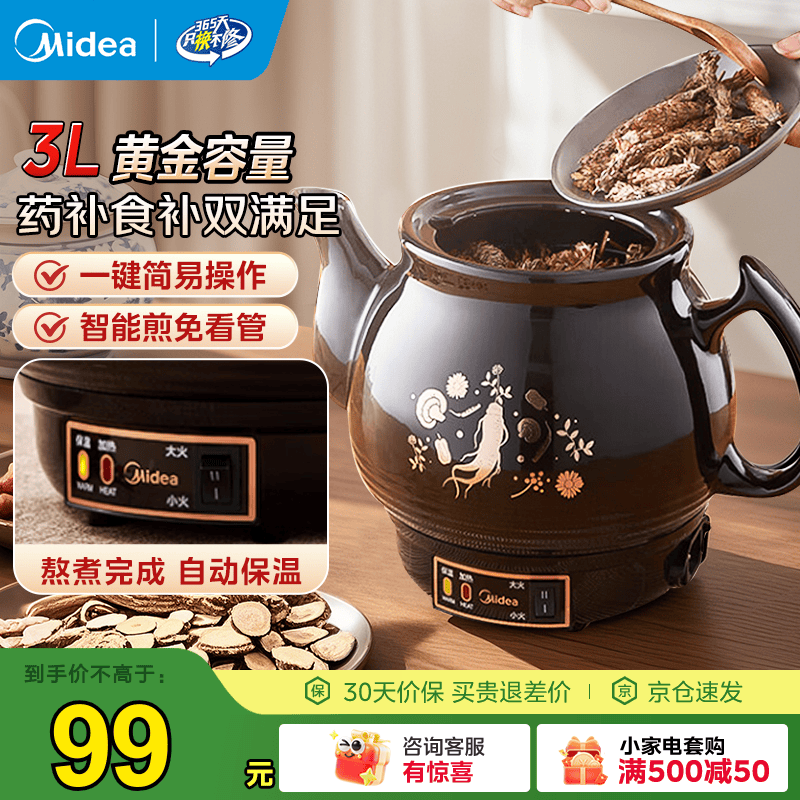 旗舰店美的(Midea)中药锅煎药壶 智能全自动陶电砂锅炖药锅煲 养生壶中药罐中药壶煮药壶熬药壶一体式【国家补贴】 【智能免看管】MD-DG30E103 3L