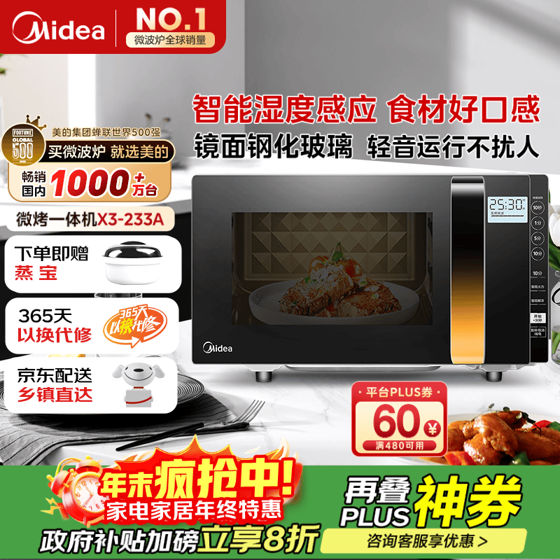 自营美的(Midea)微波炉烤箱一体机变频家用微波炉900W微烤一体23升平板加热杀菌易清洁X3-233A金色