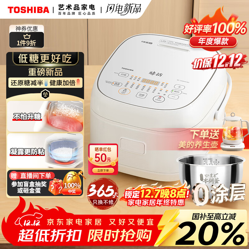 自营东芝(TOSHIBA)【国家补贴20%】白珍珠0涂层电饭煲4-5人无涂层316L不锈钢家用低糖电饭煲4升一级能效RC-15HOVC(W)