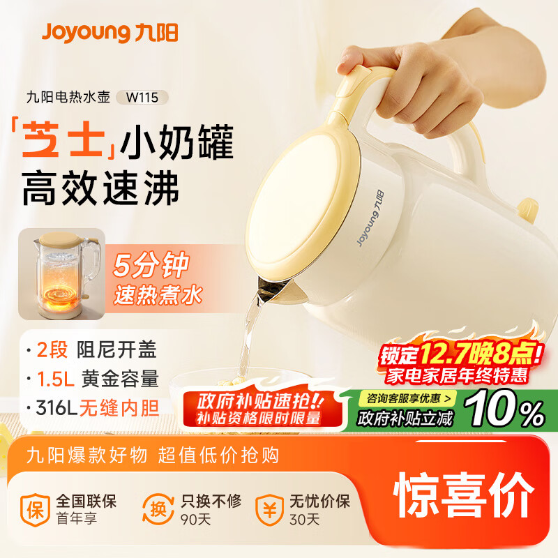自营九阳(Joyoung)热水壶烧水壶电水壶 双层壶体316L不锈钢 一体无缝内胆 1.5L家用0胶水电水壶 K15FD-W115