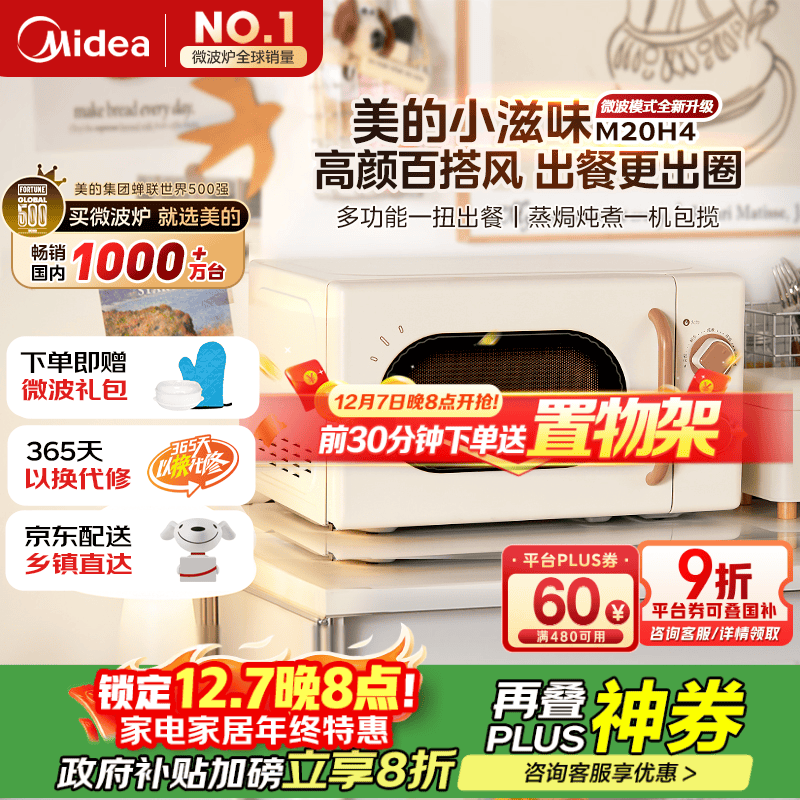 自营美的【国家补贴8折】厨房小家电小滋味微波炉变频家用小型百搭复古转盘式经典双旋钮轻音(M20H4)