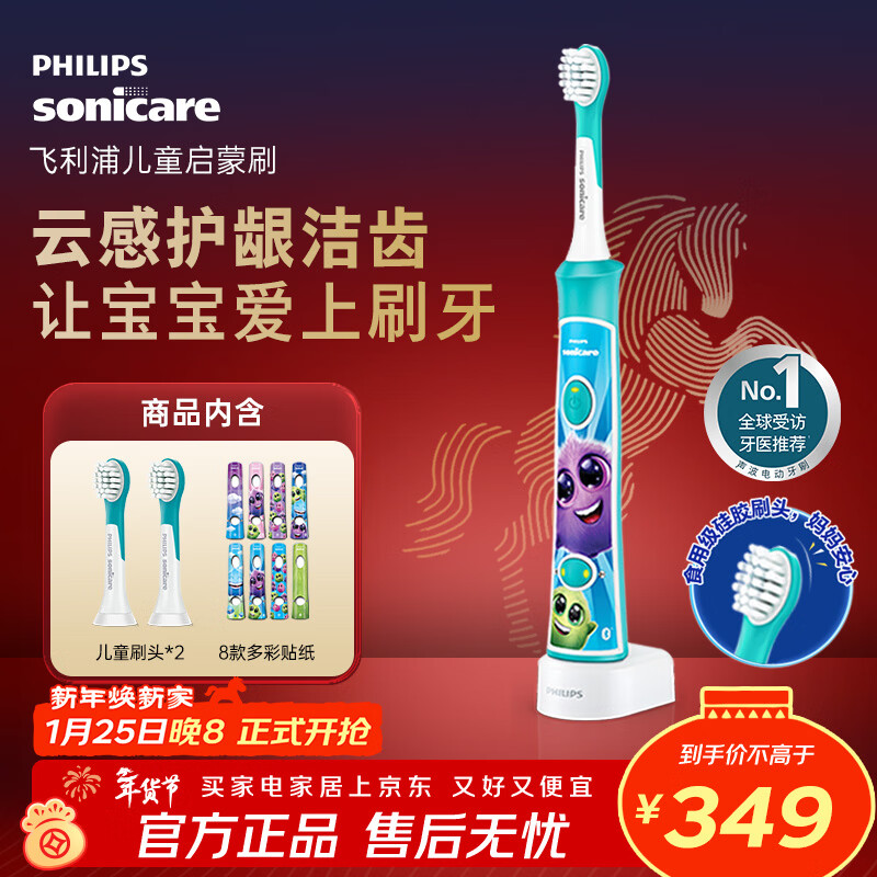 自营飞利浦(PHILIPS)儿童电动牙刷 儿童生日新年礼物 送男孩女孩 蓝牙版适用4-12岁 自带2支刷头8款贴纸 蓝色HX6322