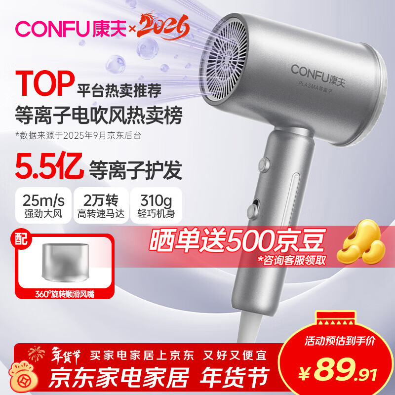 自营康夫(CONFU)5.5亿等离子电吹风机大风力速干护发不伤发宿舍男士女士家用负离子吹风筒生日新年礼物KF-3158幻银