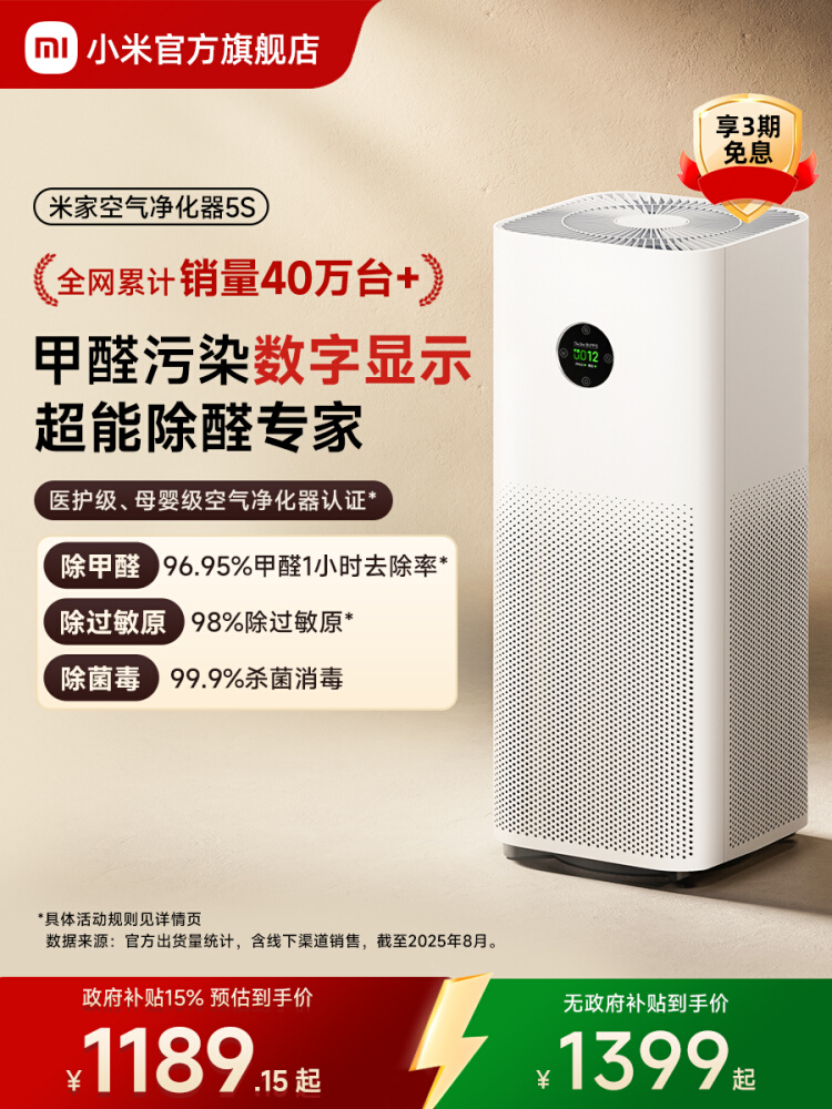 旗舰店小米官旗米家空气净化器5S除甲醛菌数显吸烟宠物家用医护级净化机