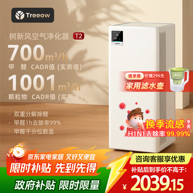 自营树新风空气净化器除甲醛异味除菌除过敏认证家用宠物大空间全效T2pro净化器【家电国家补贴】