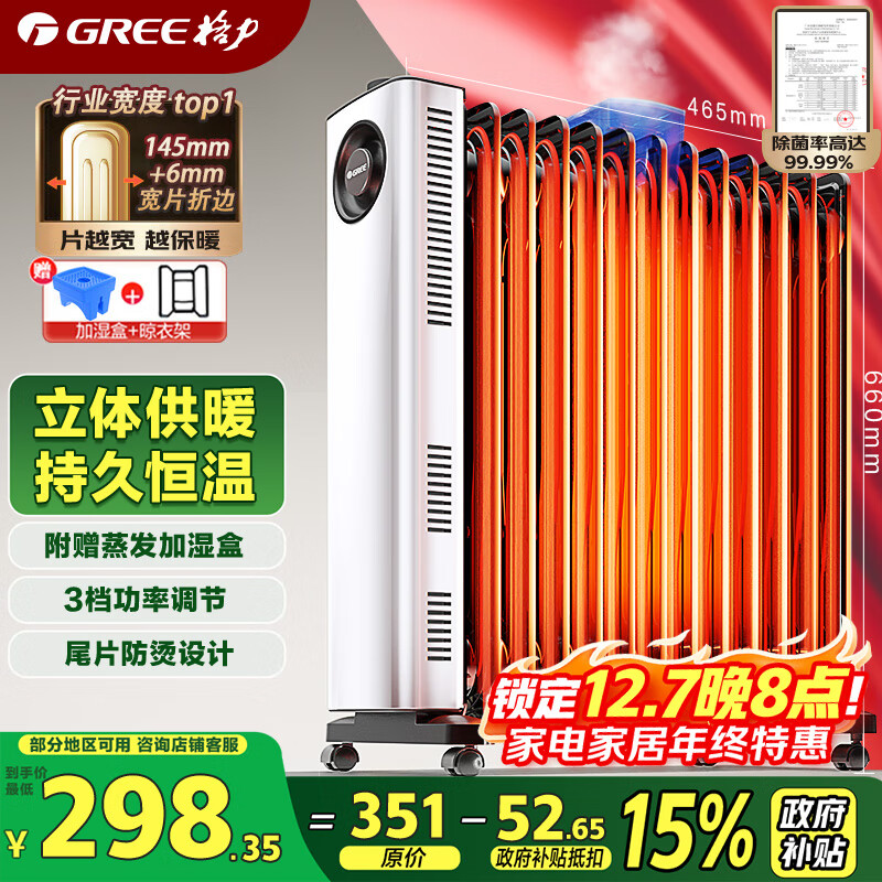 自营格力(GREE)【年度金榜单品】取暖器/电热油汀/加热电暖器/立式电暖气/加热器家用大面积加湿宽片 NDY23-X6022