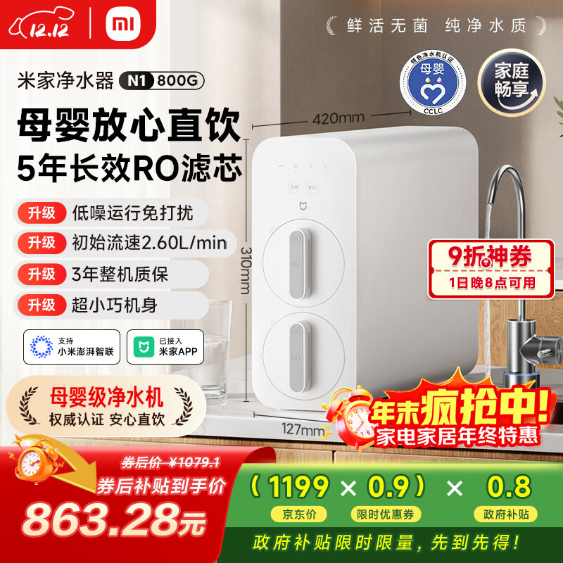 自营米家小米净水器N1 800G大通量 母婴级净水认证 厨房台下家用 5年RO反渗透 小米发布会MR872