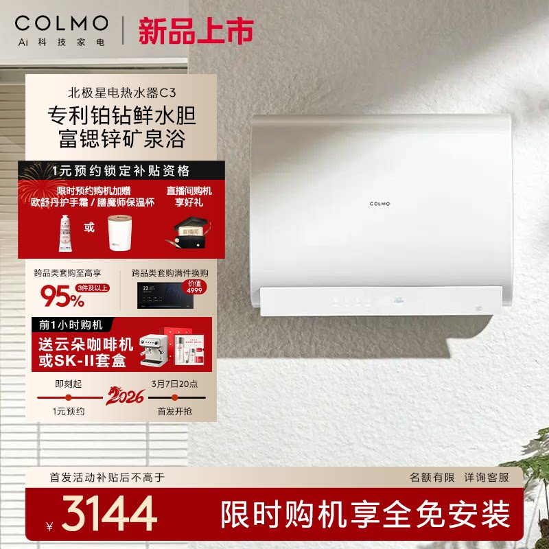 旗舰店COLMO北极星电热水器C3家用浴室洗澡双胆速热无镁棒富锌矿泉浴60L