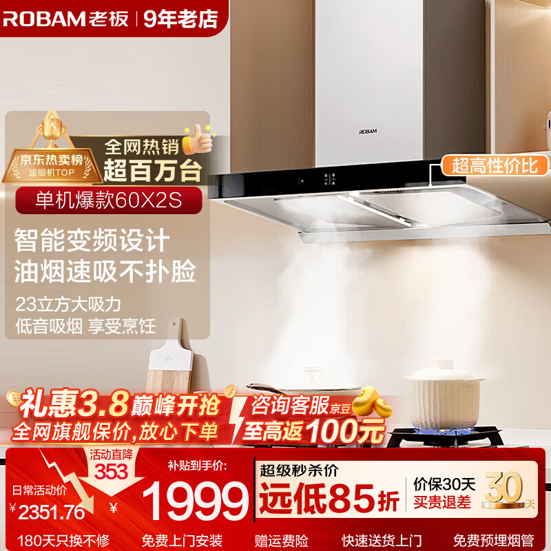 旗舰店老板(Robam)油烟机 【巨能吸】欧式升级23风量大吸力变频抽吸油烟机燃气灶套装低噪音/免拆洗 60X2S单烟机