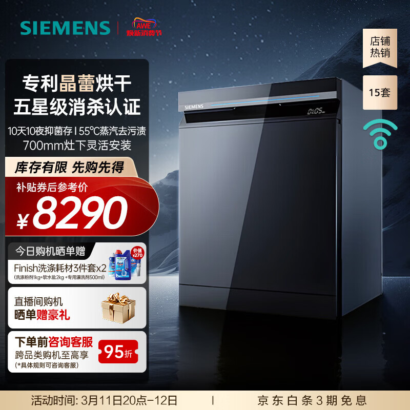 旗舰店西门子(SIEMENS)【智净魔方】洗碗机灶下 15套嵌入式 142升 晶蕾烘干 700mm高度 240小时长效抑菌存 超五星级除菌 SE45ZB25KC