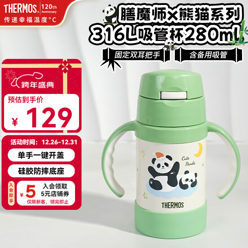 旗舰店膳魔师儿童水杯316L保温杯带把手婴儿水杯宝宝吸管杯幼儿园学生水杯TCKK 熊猫保温杯280ml(含备用吸管)