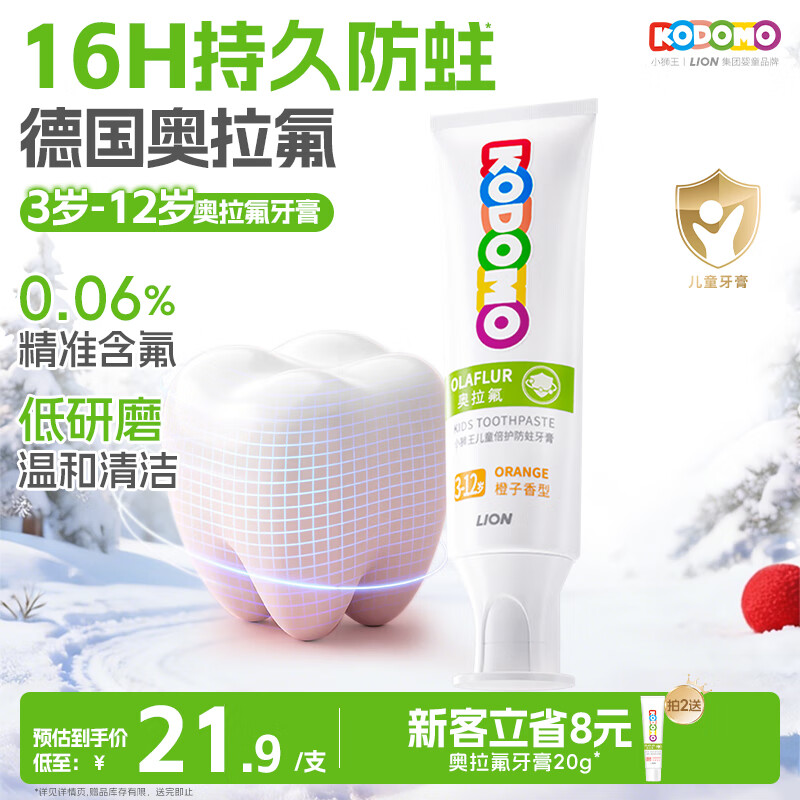自营狮王(Lion)小狮王奥拉氟儿童牙膏3-6-12岁 含氟防蛀防龋宝宝牙膏橙子香型50g