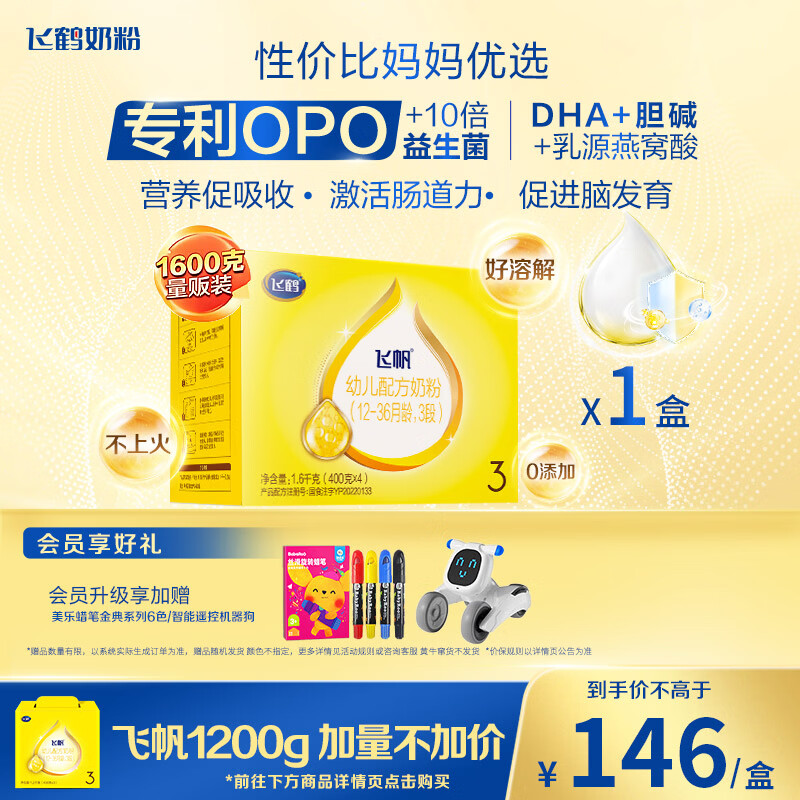 自营飞鹤飞帆OPO促吸收幼儿配方奶粉3段(12-36月龄)1600克 DHA好脑力