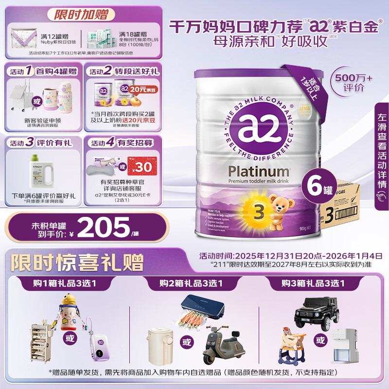 自营a2奶粉紫白金幼儿配方奶粉3段(1岁+)900g*6 【高营养好吸收】