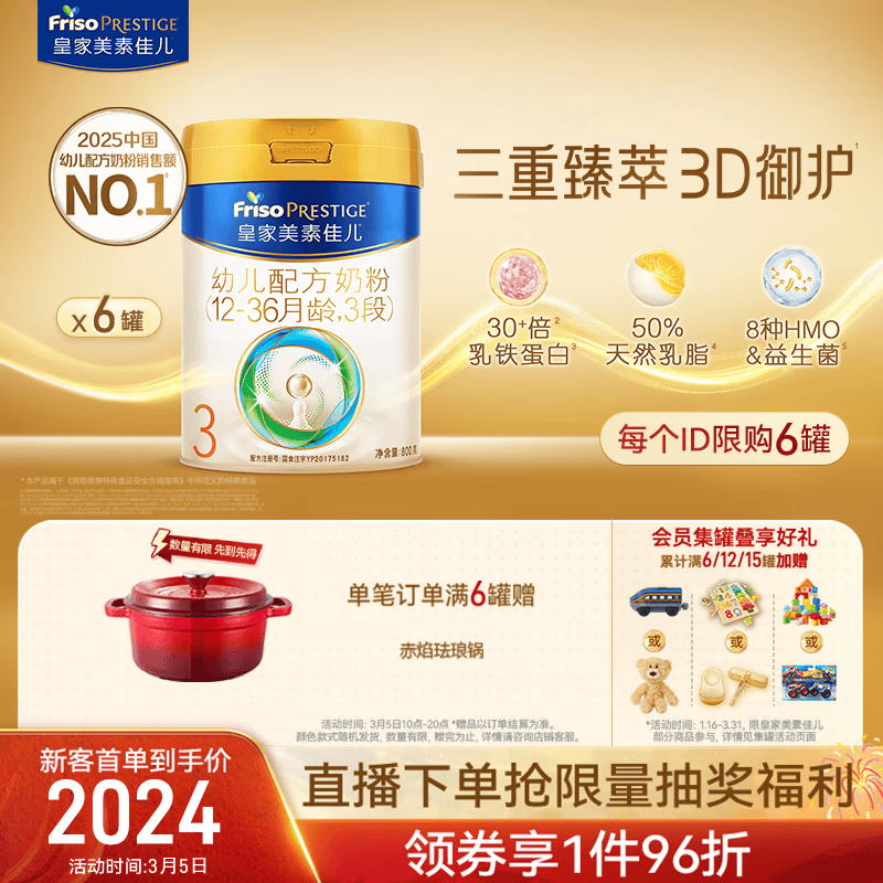 自营美素佳儿(Friso)皇家幼儿配方奶粉3段(1-3岁幼儿适用)800g*6罐 乳铁蛋白