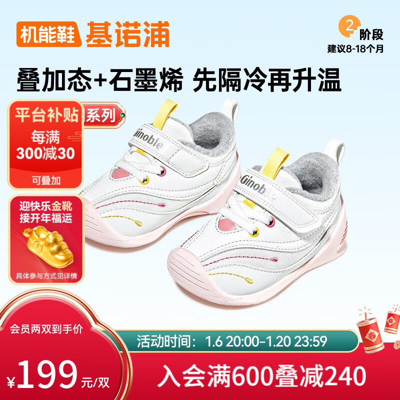 旗舰店基诺浦软底宝宝学步鞋 24冬季男女儿童加绒石墨烯保暖棉鞋GB2367 白色/粉色 19.5 120mm 适合脚长116-124mm